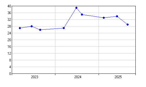 | Aika | Arvo | | 8.3.2023 | 27 | | 15.6.2023 | 28 | | 28.8.2023 | 26 | | 12.3.2024 | 27 | | 26.6.2024 | 39 | | 13.8.2024 | 35 | | 13.2.2025 | 33 | | 3.6.2025 | 34 | | 1.9.2025 | 29 |