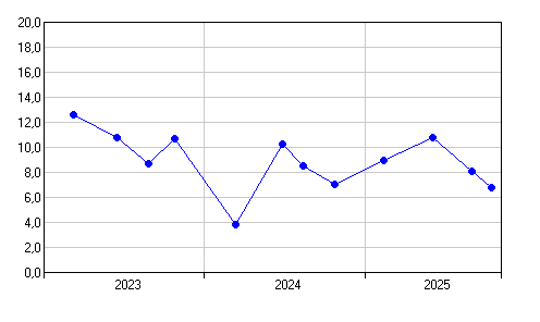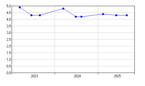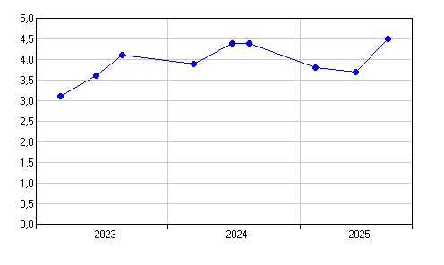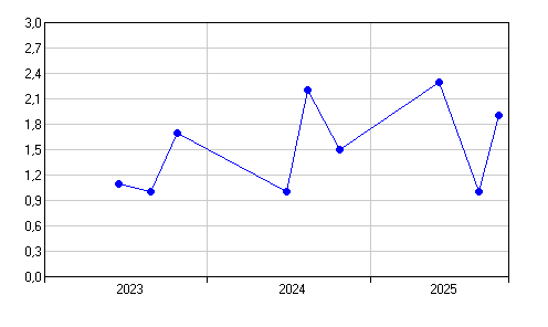 | Aika | Arvo | | 8.3.2023 | 12,6 | | 15.6.2023 | 10,8 | | 28.8.2023 | 8,7 | | 25.10.2023 | 10,7 | | 12.3.2024 | 3,8 | | 26.6.2024 | 10,3 | | 13.8.2024 | 8,5 | | 23.10.2024 | 7,0 | | 13.2.2025 | 9,0 | | 3.6.2025 | 10,8 | | 1.9.2025 | 8,1 | | 15.10.2025 | 6,8 |