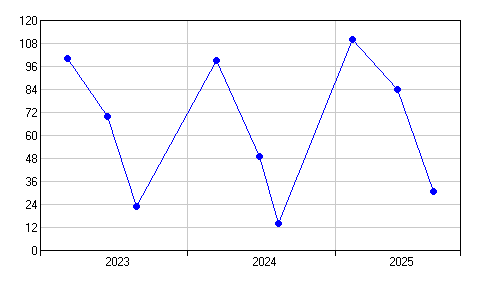 | Aika | Arvo | | 8.3.2023 | 100 | | 15.6.2023 | 70 | | 28.8.2023 | 23 | | 12.3.2024 | 99 | | 26.6.2024 | 49 | | 13.8.2024 | 14 | | 13.2.2025 | 110 | | 3.6.2025 | 84 | | 1.9.2025 | 31 |
