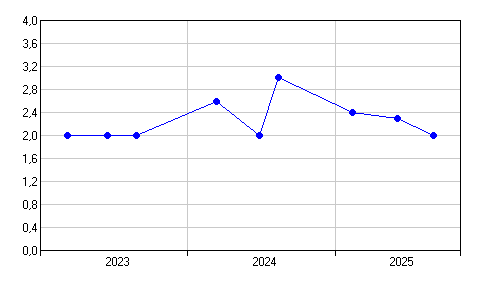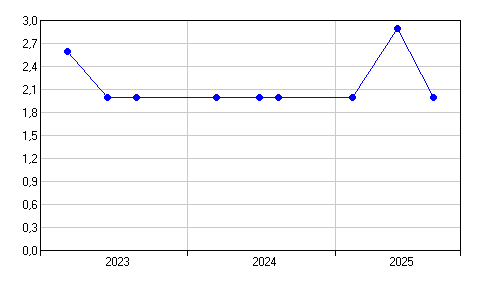 | Aika | Arvo | | 8.3.2023 | 2,0 | | 15.6.2023 | 2,0 | | 28.8.2023 | 2,0 | | 12.3.2024 | 2,6 | | 26.6.2024 | 2,0 | | 13.8.2024 | 3,0 | | 13.2.2025 | 2,4 | | 3.6.2025 | 2,3 | | 1.9.2025 | 2,0 |