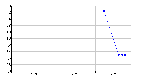 | Aika | Arvo | | 19.3.2025 | 7,4 | | 23.7.2025 | 2,0 | | 25.8.2025 | 2,0 | | 17.9.2025 | 2,0 |